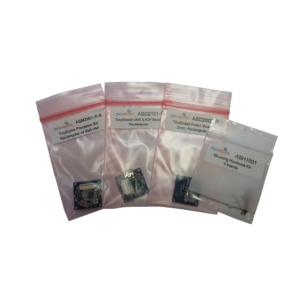This kit has the bare essentials to get going with the TinyDuino! This kit includes the TinyDuino Processor Board w/ battery holder, the TinyShield USB & ICP Board, one TinyShield Proto 1 board, and a 3 board mounting kit (Screws, nuts and standoffs) and basic instructions on how to get going.